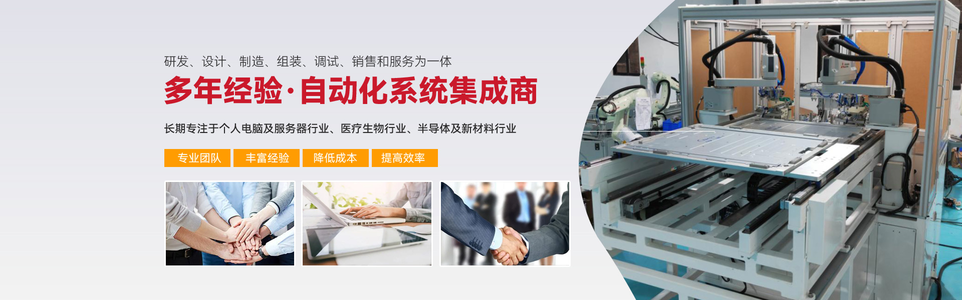 ※ 長(zhǎng)期專注亍個(gè)人電腦及服務(wù)器行業(yè)、醫(yī)療生物行業(yè)、半導(dǎo)體及新材料行業(yè)三大行業(yè)的自動(dòng)化組裝、檢測(cè)設(shè)備的生產(chǎn)與開(kāi)發(fā)。